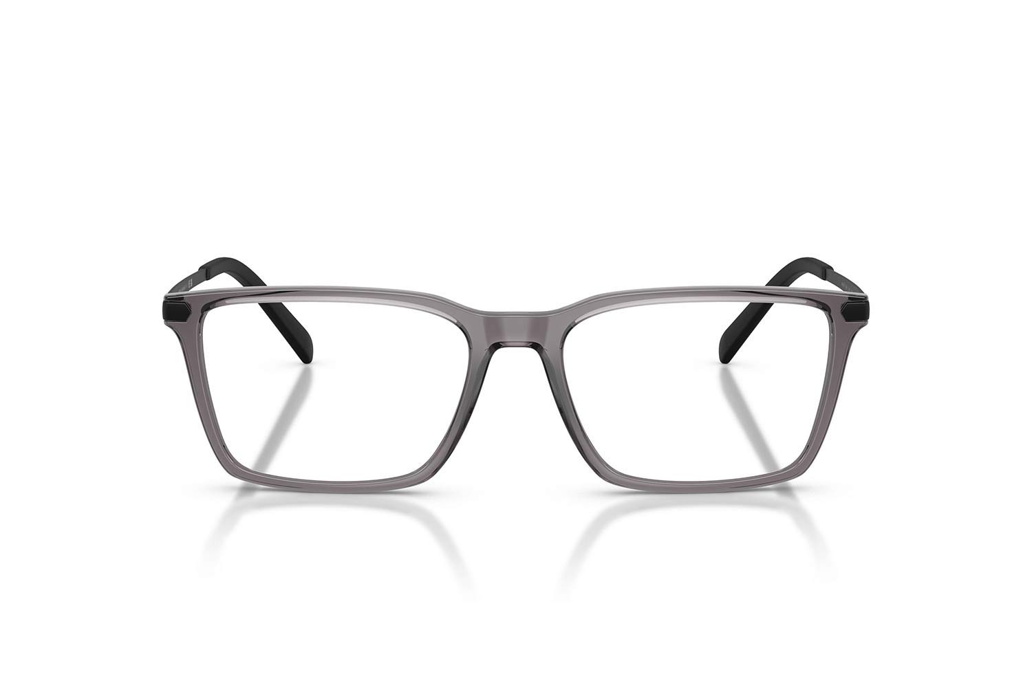 Rettangolare. Si tratta di Uomo con montattura fatta da materiale Iniettato di colore Grey Shiny Transparent Grey Aste: Metal.